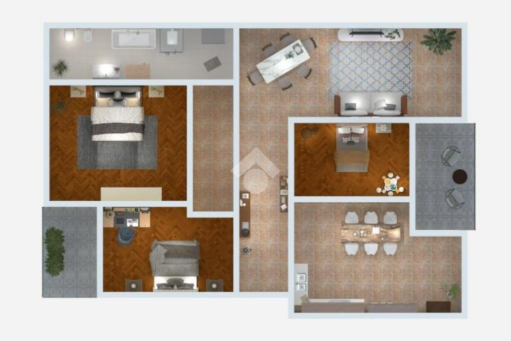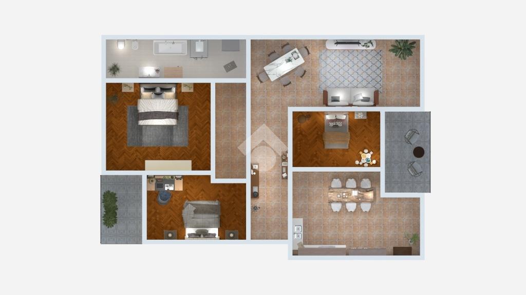 L’appartamento è così composto: ingresso in disimpegno, sulla destra troviamo la cucina abitabile con alte finestre ed accesso al primo balcone e la prima cameretta. Proseguendo dritto ci accoglie il soggiorno di ampie metrature. Alla sinistra del disimpegno accediamo alla zona notte dove troviamo, in ordine, la seconda cameretta con accesso al secondo balcone, la camera matrimoniale con anch’esso accesso esterno e il bagno finestrato sviluppato in lunghezza con box doccia e vasca da bagno.