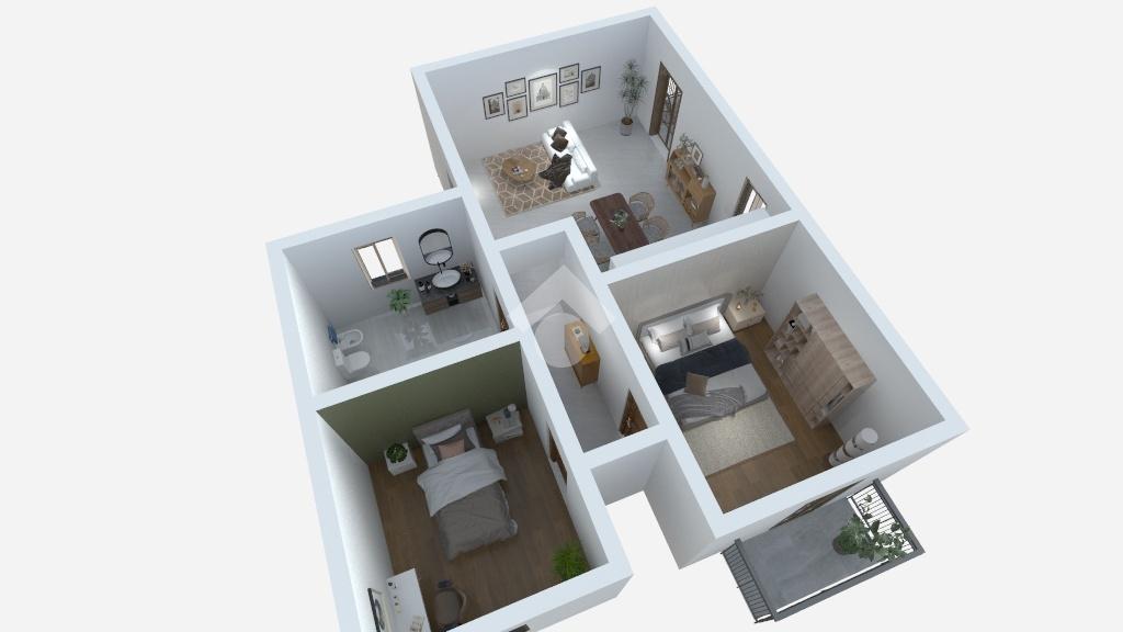 L’appartamento è così composto: ingresso direttamente nel soggiorno con cucina a vista ed il primo balcone. Proseguendo nel piccolo disimpegno, veniamo accolti nella zona notte composta da bagno finestrato con box doccia e vasca e alle due camere; la prima matrimoniale con il secondo balcone e la seconda che consiste nella cameretta.